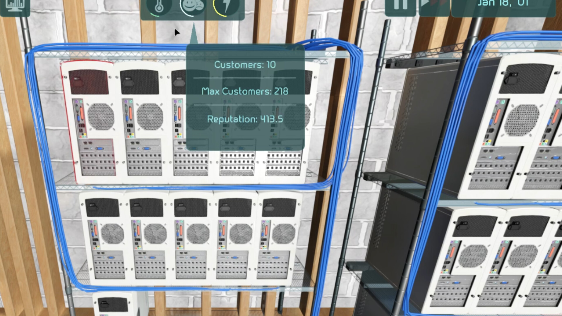 In the Ping Profit Demo, you’ll start your web hosting journey in a cramped basement with just a few budget servers and limited resources. Master the basics of running a successful hosting business—buy servers, manage heat, keep your customers online, and solve problems before they turn into disasters.