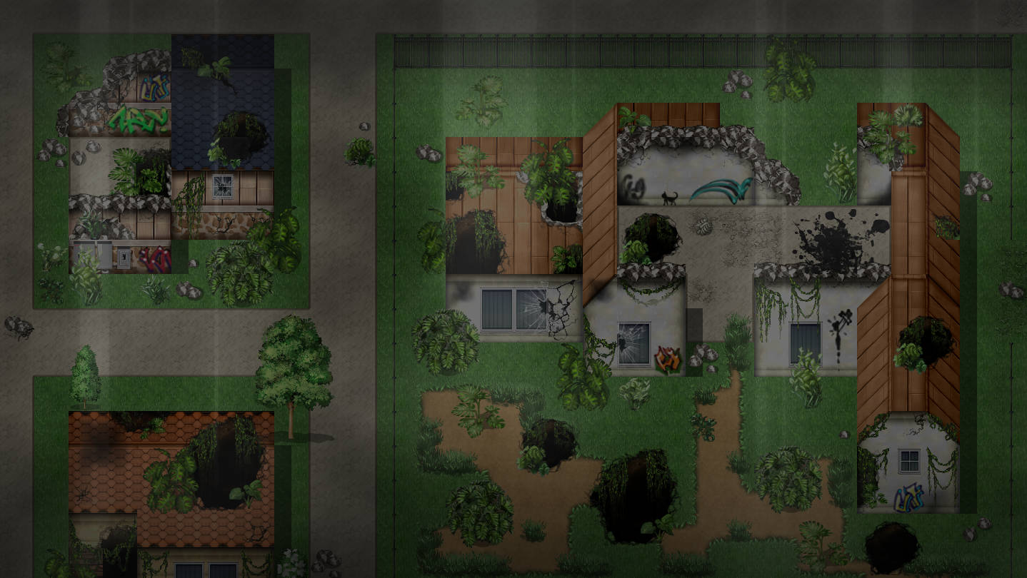 Destroy your hero’s hometown and give him a painful reason to defeat the dark lord with the KR Ruins Kit! Kokoro Reflections is back with a unique MV/MZ-sized pack that’s meant to be used with other tiles. Instead of having to replace an entire tileset style to show damage, create your own ruined villages with this pack! Overlays for A2 and A4 tiles along with 4 B sheets offer a lot of ways to damage and destroy a previously peaceful house. Remove the roof of a building and top its walls with broken stone, and stream trash and broken planks of wood around it to show where parts of the building ended up. Coat walls with smudges of dark grime and growing moss, or cover them with graffiti from the local hooligans. Want to show that the town was recently destroyed? Then drop splatters of blood all over the town square and leave a few skeletons tucked away in corners where NPCs thought they could safely hide. Need to show that it’s been more than a decade since someone entered a cursed village? Let plants and nature grow freely from holes in walls and have vines hanging between houses. And if you want a meteorite to have struck the town to start all the troubles, then make use of this pack’s holes and pits with mysteriously colored liquids in the bottoms!