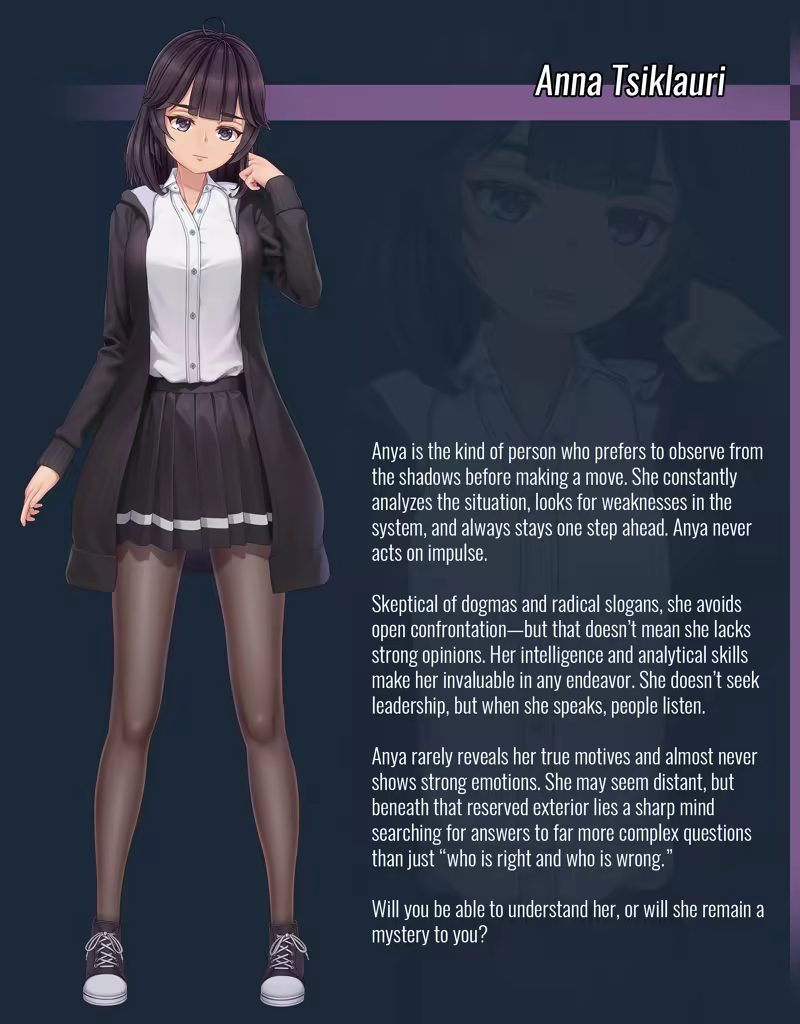 • Anya – A careful observer, hesitant to make rash decisions, always weighing every step.