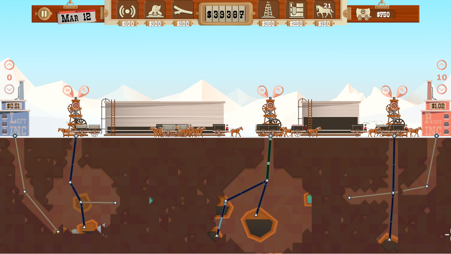Lease land at the town auction and search for oil. Build a rig, create an efficient pipe network and bring up the oil to store it in silos. Sell the oil at the best times to maximize profits. Then buy essential upgrades in town to cope with rock, gas and ice. Acquire more town shares than your competitors in a bid to become the new mayor.