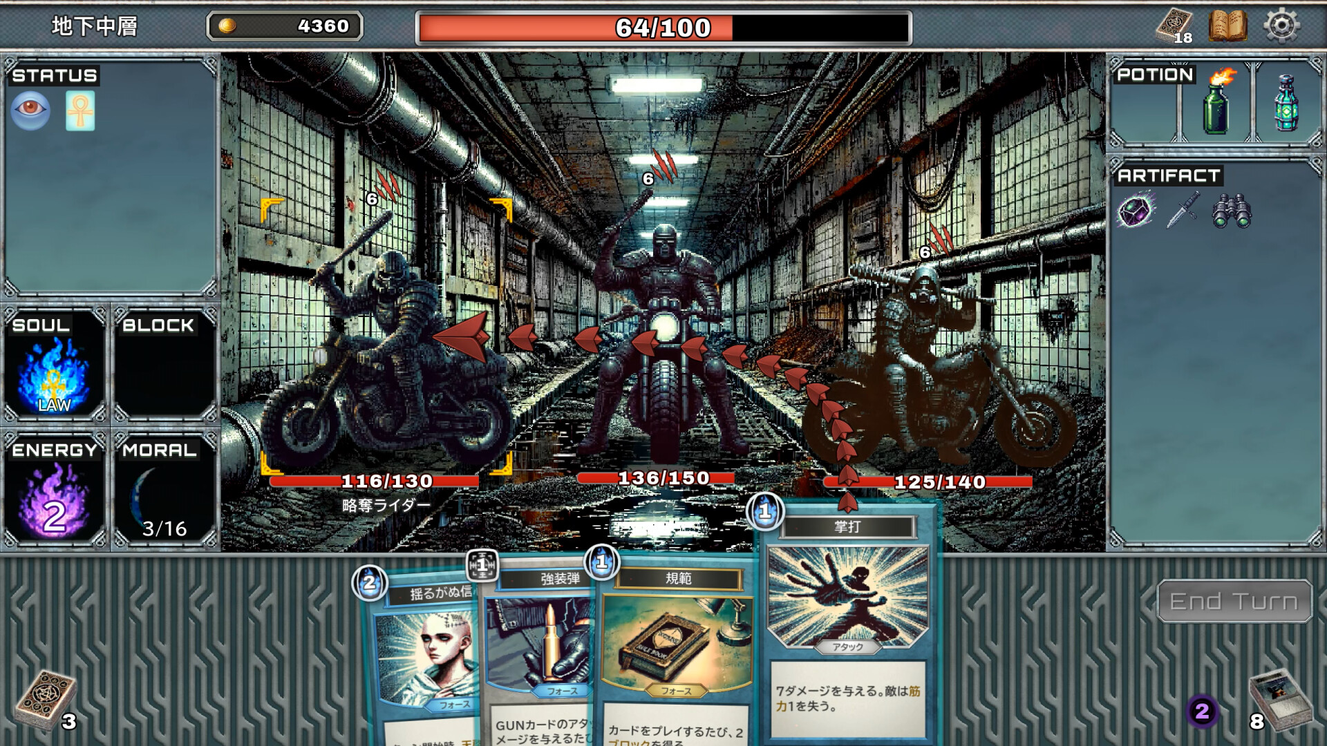 戦争後の荒廃した地下世界を舞台にした、デッキ構築ローグライトゲームです。あなたの選択によって、自身のモラルやソウルが変化し、戦略や報酬に影響します。世界の真実を求めて、地下深くに進んでいく...。