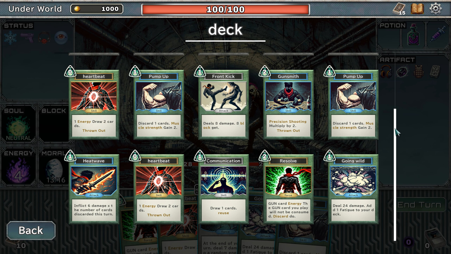 "UNDER WORLD" is a deck-building roguelite set in a post-war, devastated underground world. Build a unique deck by combining cards and items, defeat enemies, and delve deeper into the underground.