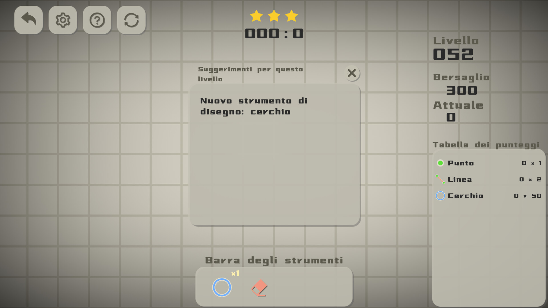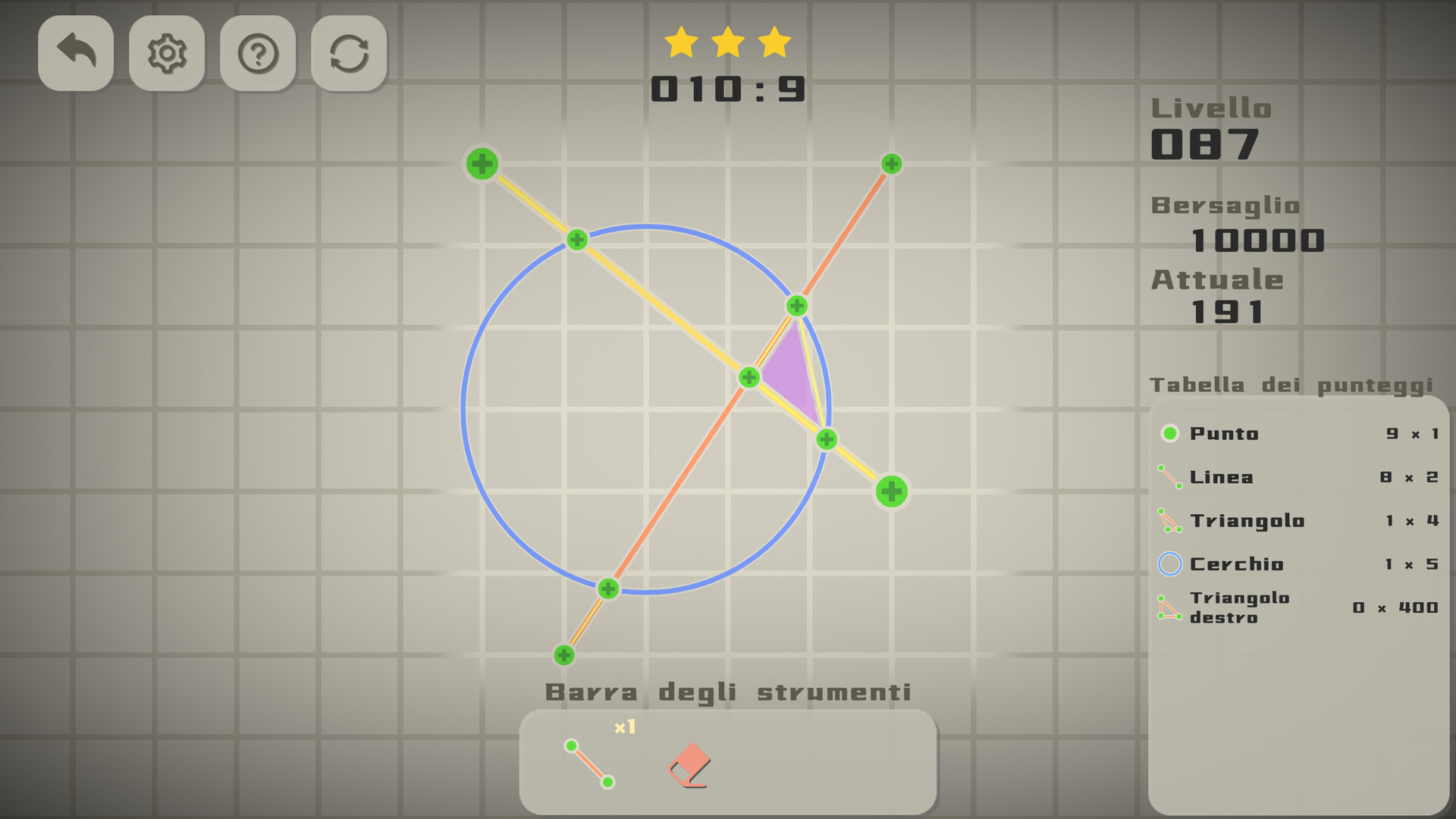 Utilizza elementi geometrici di base (punti, linee, cerchi) per creare infinite forme. Completa obiettivi entro limiti di tempo e scopri l'armonia tra matematica e design.