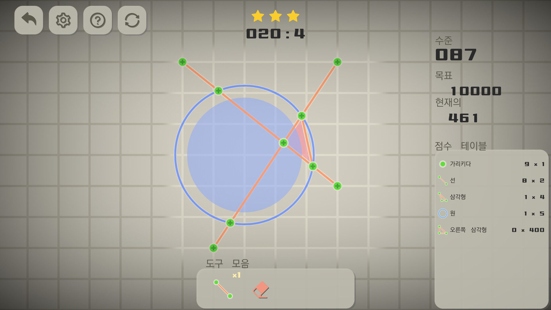점, 선, 원 등 기본 도형으로 무한한 패턴을 창조하세요. 시간 제한 내에 목표 점수를 달성하며 기하학의 아름다움을 느껴보세요.
