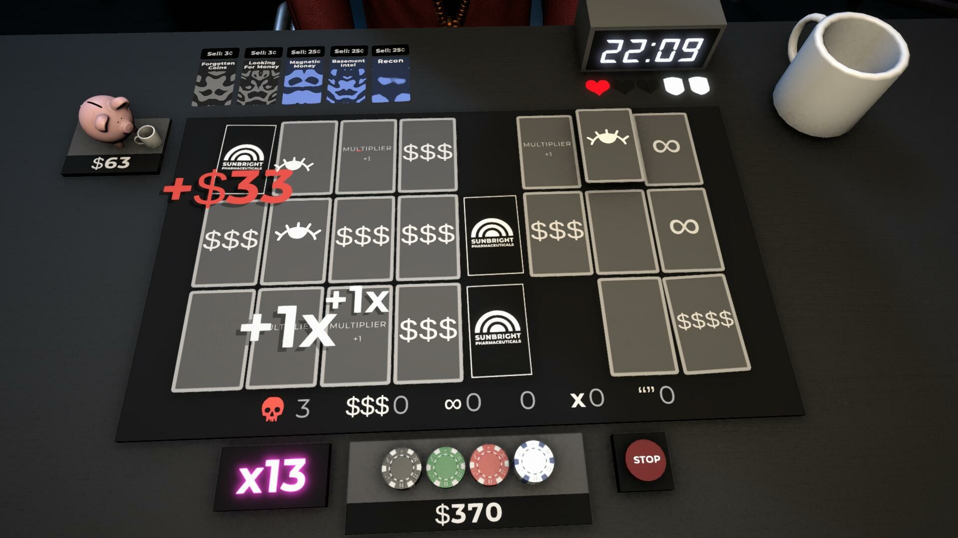 • Push your Luck mixed with logical deduction. There are many moments where you must decide whether it's worth it to risk a hit for the chance at more money. If you're clever though, you can sometimes use the hints to deduce where the bad cards are to avoid them. Some players have said it can feel like a "minesweeper roguelike."