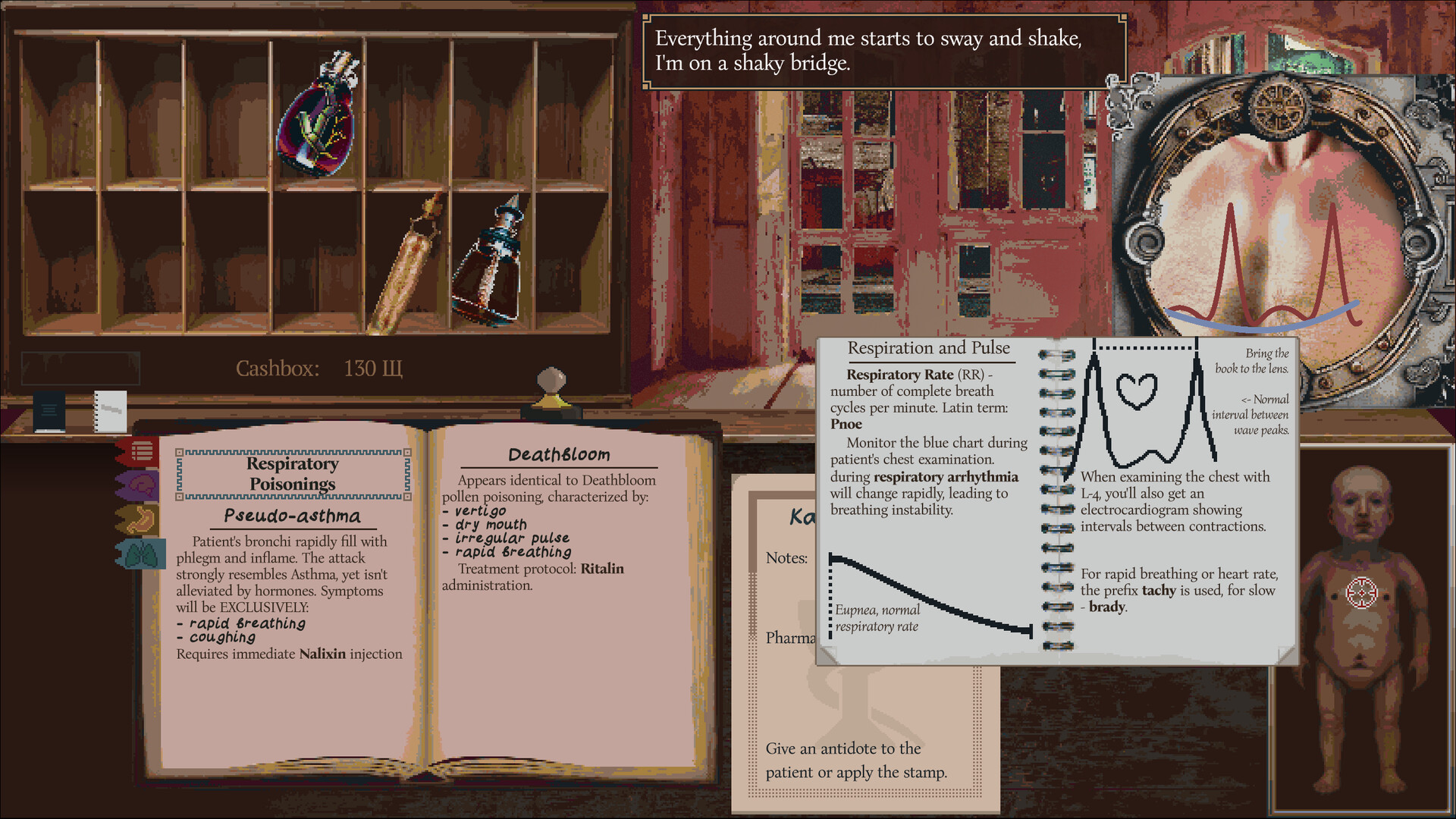 An antidote shop simulator in a grimdark setting. Save lives by diagnosing poison types and administering precious cures. Or risk playing executioner in white gloves — save one, slip another a fake cure and watch how your choice echoes through this rotten world.
