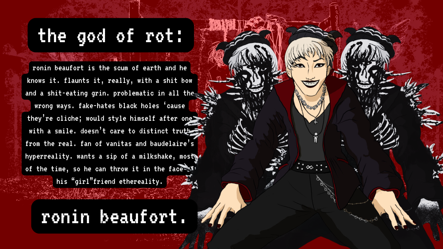 Gluttony Gods includes depictions of mental illness, death and violence, massacres, suicide, body horror, gore, gender dysphoria, unhealthy relationships, sexual assault, references to sexual assault, usage of slurs, and references to eating disorders.