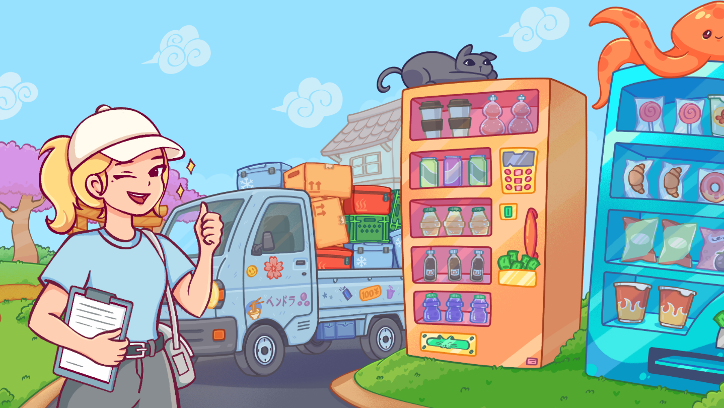 Driv ditt kawaii automatfirma! Et avslappende spill hvor du styrer, fyller opp og reparerer automater i en sjarmerende japansk by. Velg områder, kjøp snacks, sett priser, oppgrader maskiner og nyt minispill.