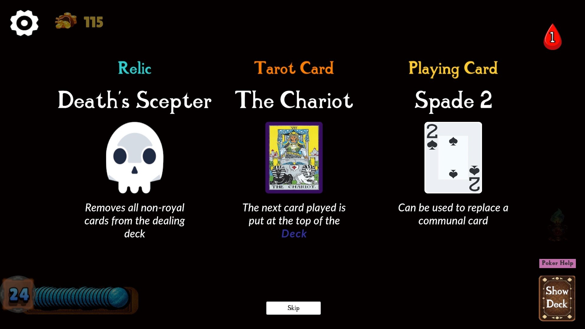 A poker-inspired roguelike deckbuilder where you choose between six Texas Hold’em hands, defeat enemies, and unlock new cards and abilities to shift the odds in your favor.