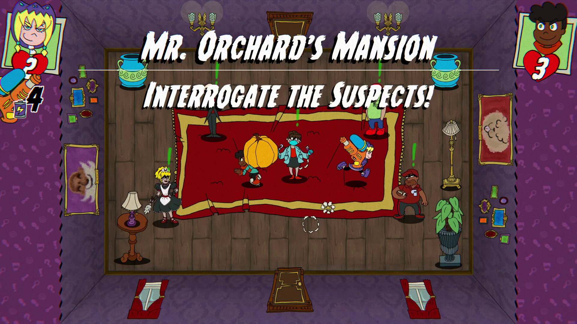 The Orchard Estate is Haunted! Investigate a spooky cartoon mansion and its zany suspects, uncover the clues, and unmask the monsters prowling its halls in this action-adventure whodunnit! But beware, the mansion appears to shift each case, and seems to hold deeper mysteries…