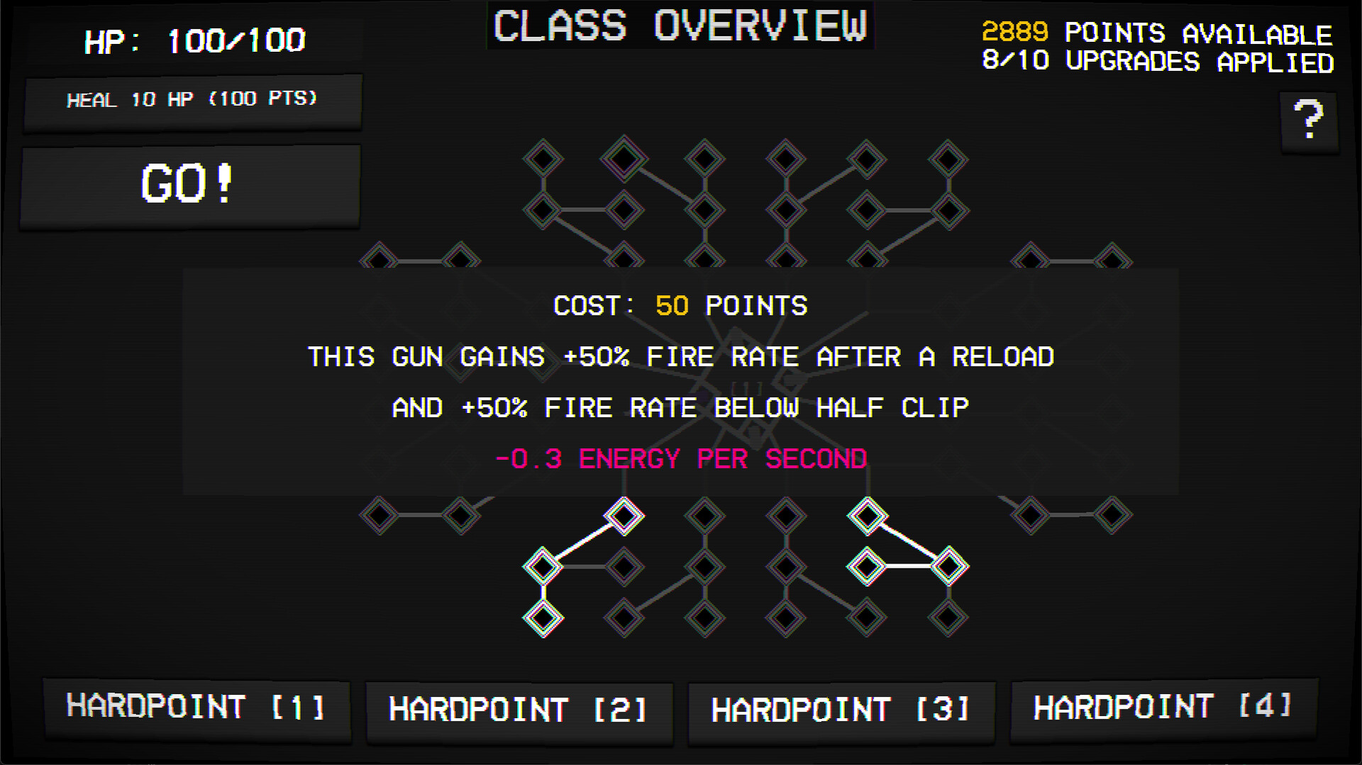 Hardpoint is a top-down arcade shooter where you control a platform of four guns, each one able to upgrade into specialized roles along a shared skill tree. Each gun on the platform can be individually customized, and selecting upgrades of the same class will grant additional abilities and bonuses.