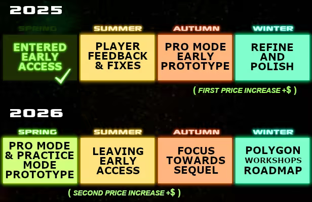 The following is a very rough “Seasonal Roadmap” of our intentions during early access :