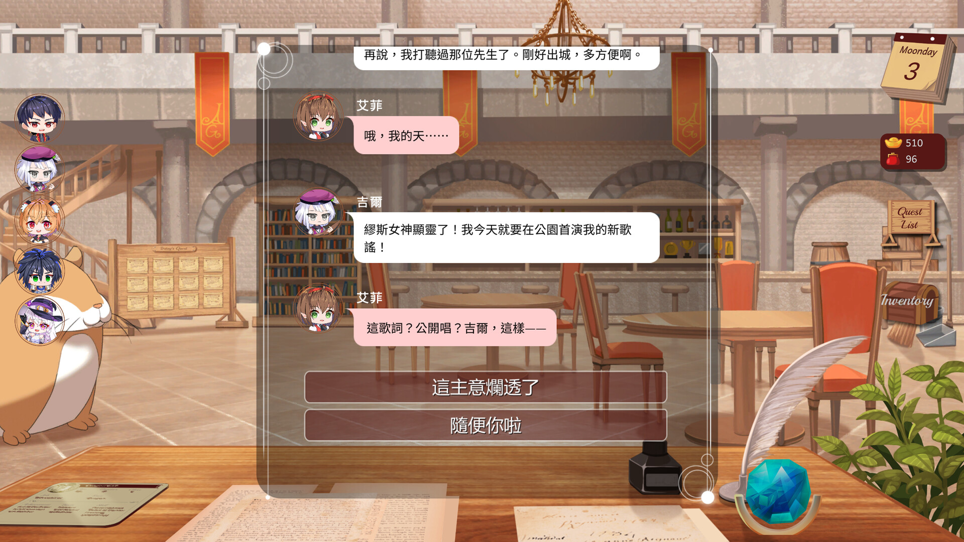 • 在每日互動中苟活下來: 跟冒險者們聊天(或吵架)。你的對話選擇可能會提升他們的幹勁,讓你得到一些小道消息,或者一不小心就引爆了誰的存在危機。挖掘他們的背景故事和內心想法,說不定還能找到未來「溝通」時可以利用的把柄。