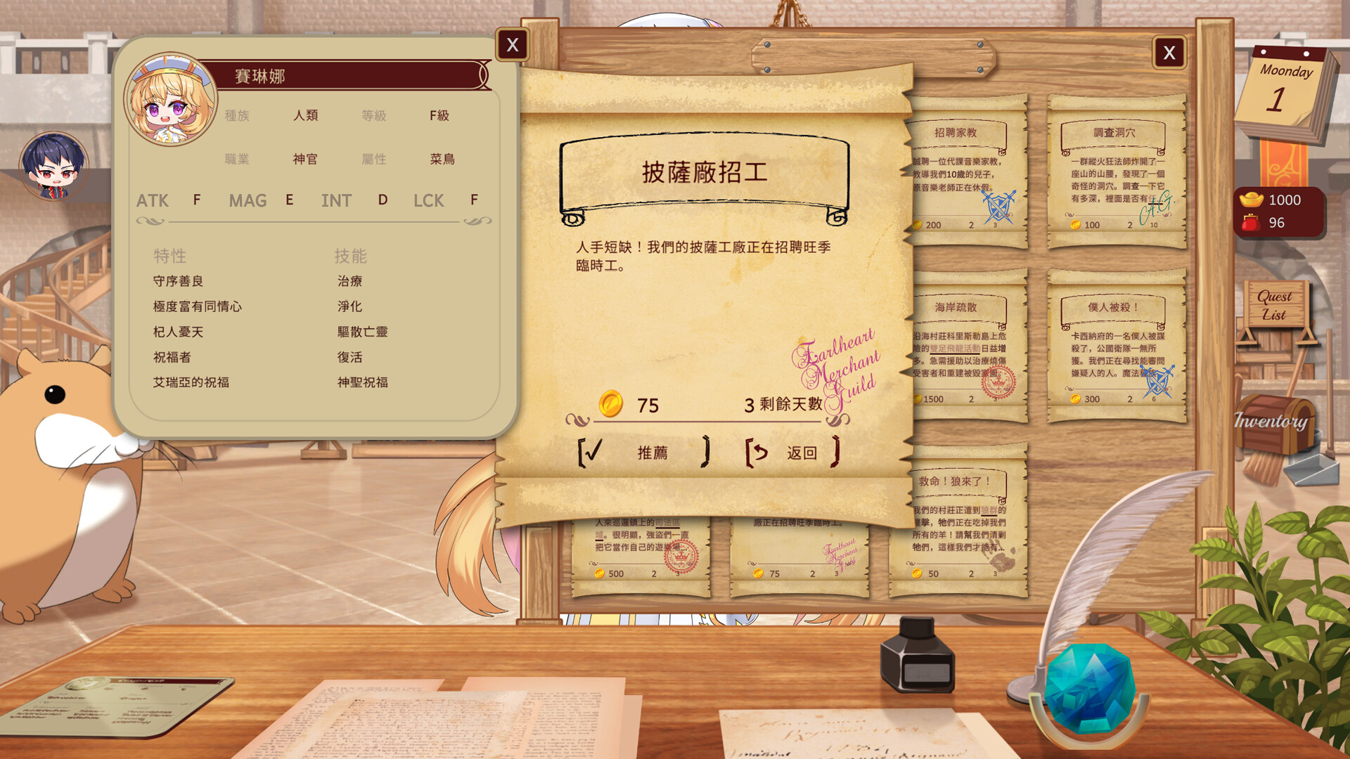 • 成為終極任務守門員: 審核那些「很有個性」的冒險者提交的奇葩任務。判斷誰有本事(少之又少)、誰根本去送死(常常如此)、誰造成的財產損失可能比他們要討伐的魔物還高。批准、拒絕,或者給點「良心」建議——任務的成敗(可能還有冒險者能不能四肢健全地回來)全都取決於你那堪憂的判斷力了!