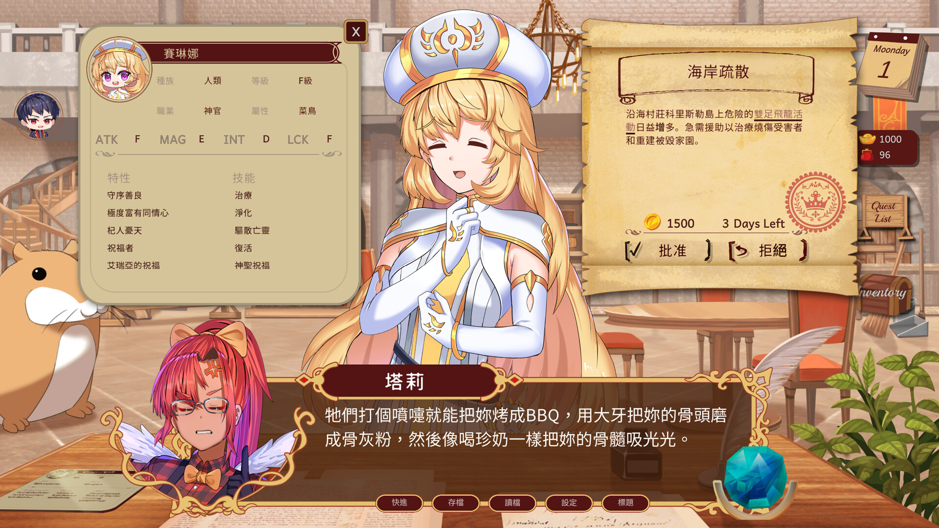 • 成為終極任務守門員: 審核那些「很有個性」的冒險者提交的奇葩任務。判斷誰有本事(少之又少)、誰根本去送死(常常如此)、誰造成的財產損失可能比他們要討伐的魔物還高。批准、拒絕,或者給點「良心」建議——任務的成敗(可能還有冒險者能不能四肢健全地回來)全都取決於你那堪憂的判斷力了!