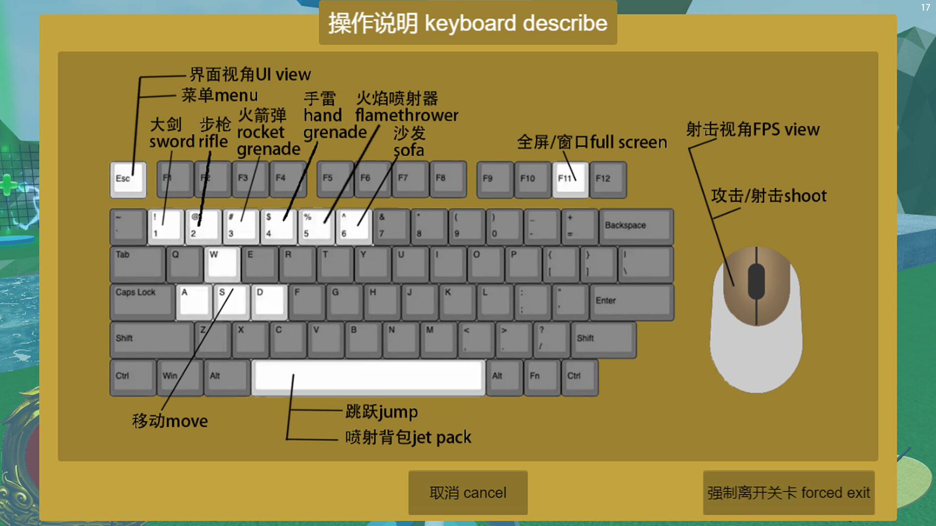 Third person shooting mode: All equipment (7 pieces: jetpack, sword, rifle, rocket launcher, grenade, flamethrower, sofa);