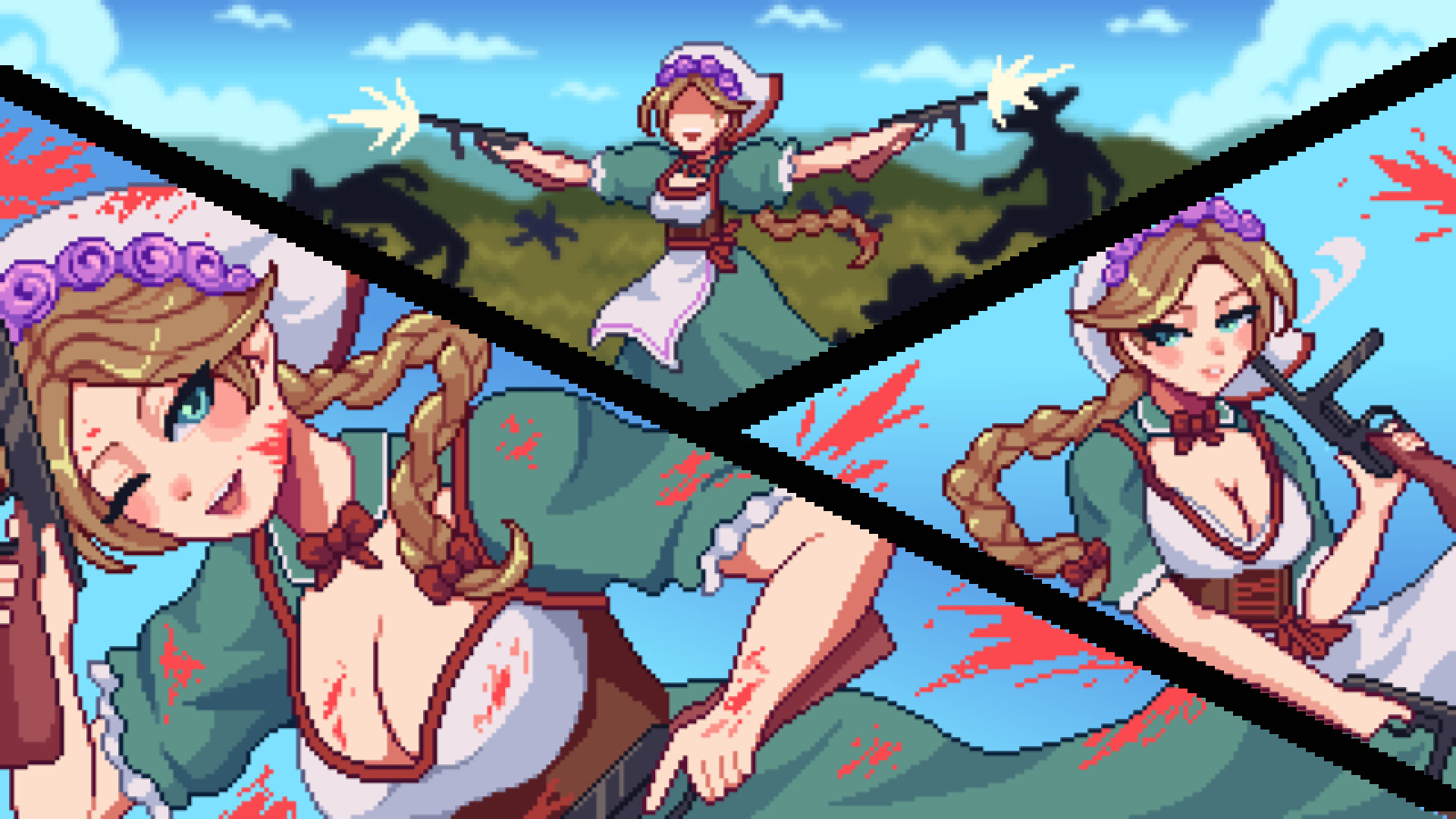 Revolver Lillies is a top-down looter shooter featuring fast-paced battles, randomly generated weapons, and comic book inspired pixel-art visuals.