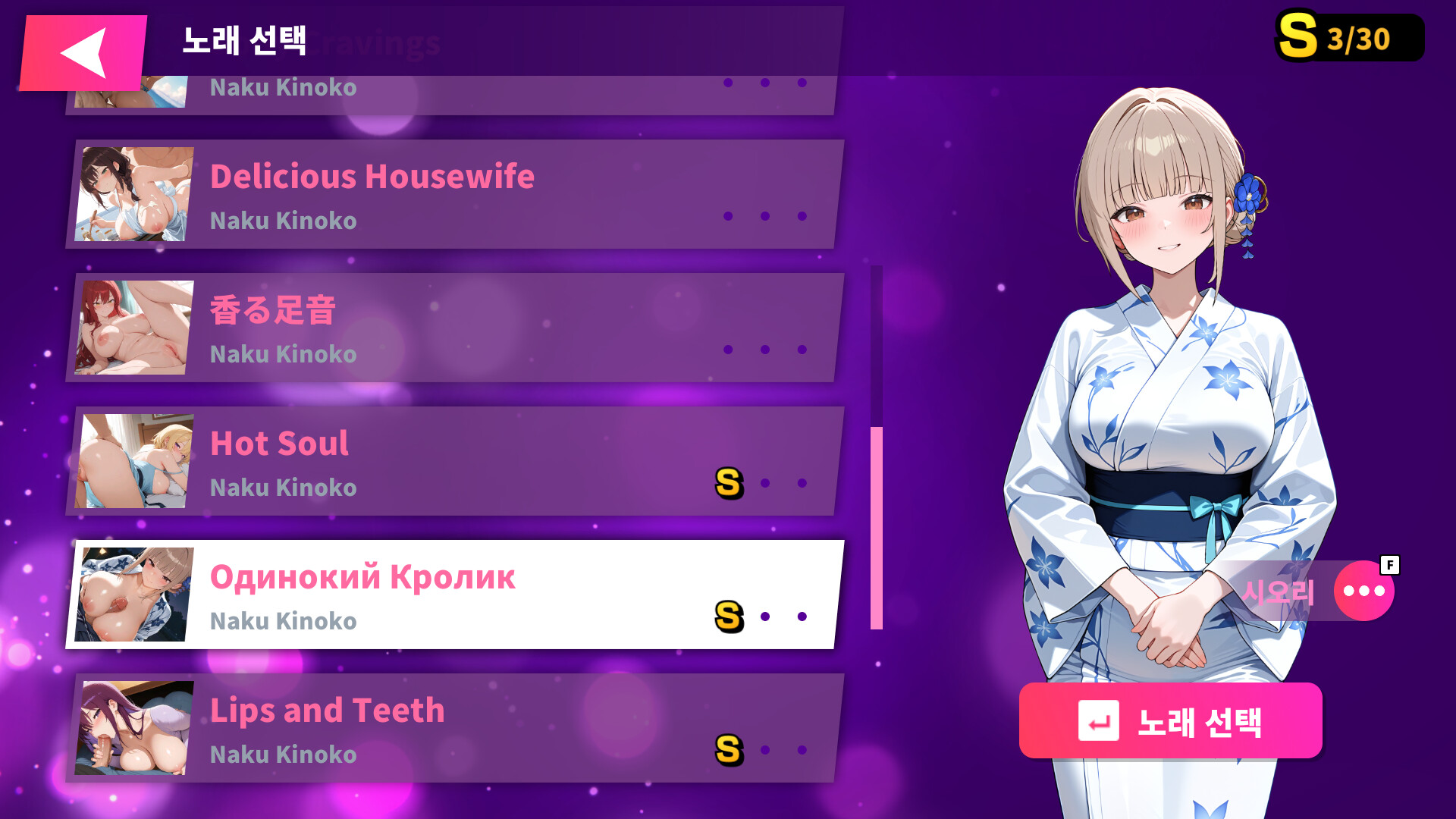 《Sex Beats》는 성인 플레이어만을 위해 제작된 음악 리듬 게임. 정밀한 비트 타이밍과 불타는 애니메 CG가 완벽 융합. 한 곡 한 곡이 시각·청각 난교 파티—노트가 춤추는 사이 에로 CG 애니가 층층이 터지며, 전례 없는 몰입 쾌감 선사!