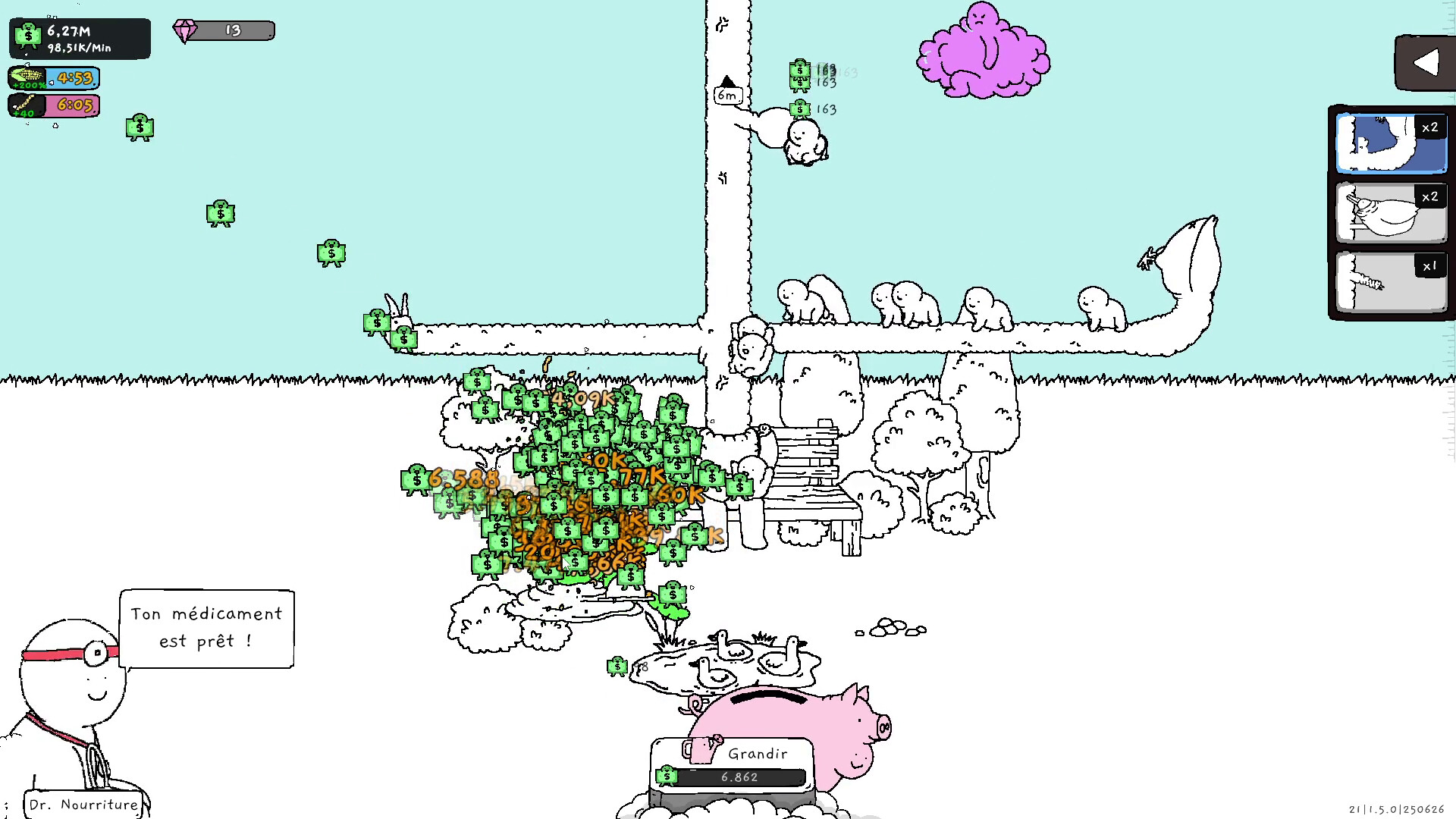 À mesure que les bébés tombent de l'arbre, ils rebondissent sur les fleurs pour générer de l'argent. Veillez à placer vos fleurs de manière stratégique pour augmenter votre rendement. Ensuite, placez des spécimens pour créer des synergies fulgurantes qui boosteront chaque rebond des bébés.
