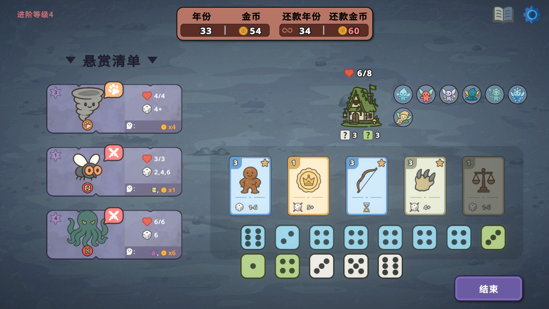 这是一款回合制策略游戏,融合了骰子与卡牌的玩法。