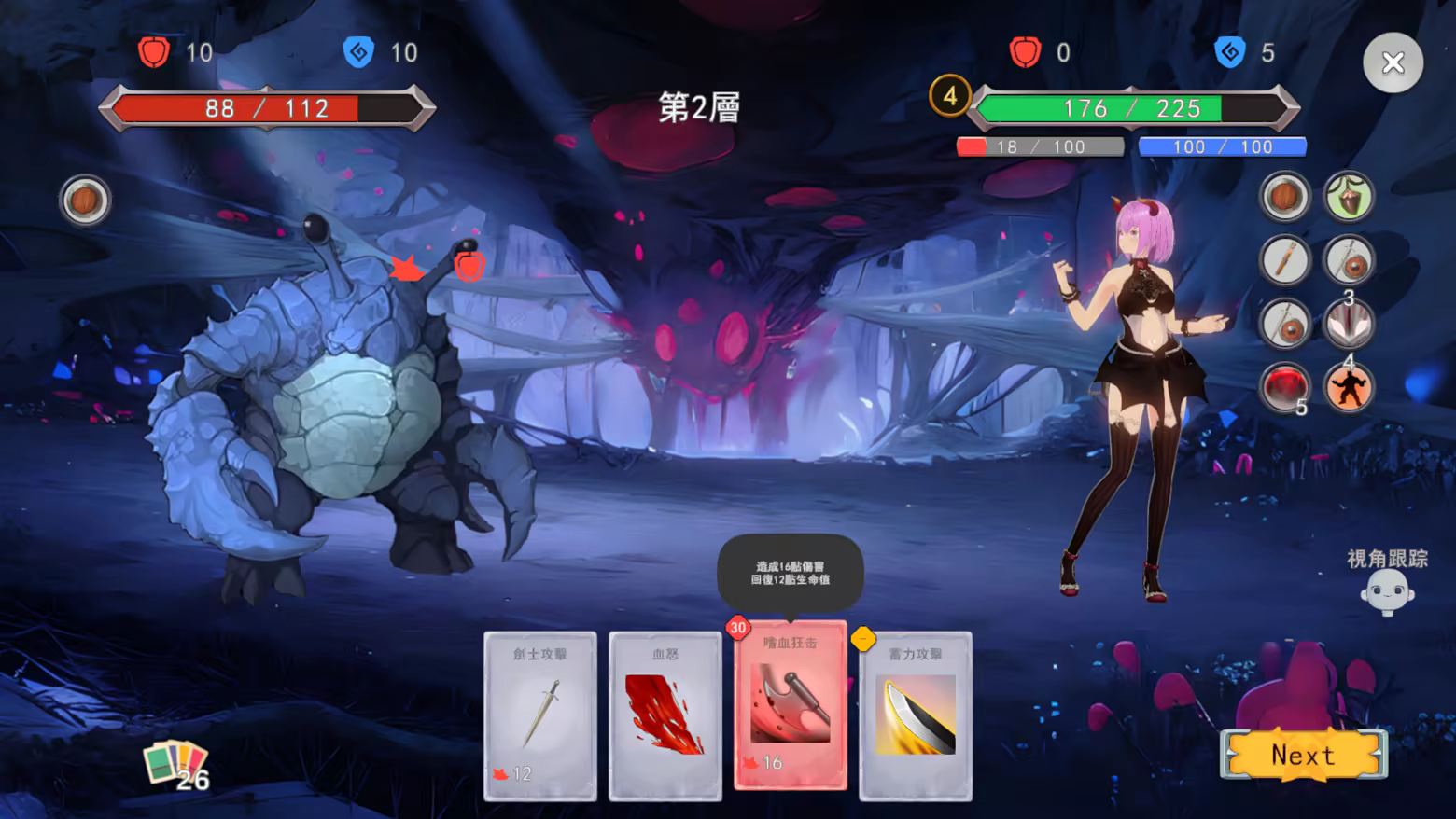 Each class comes with its own unique deck and starting conditions. Every turn is governed by action points and rage levels.