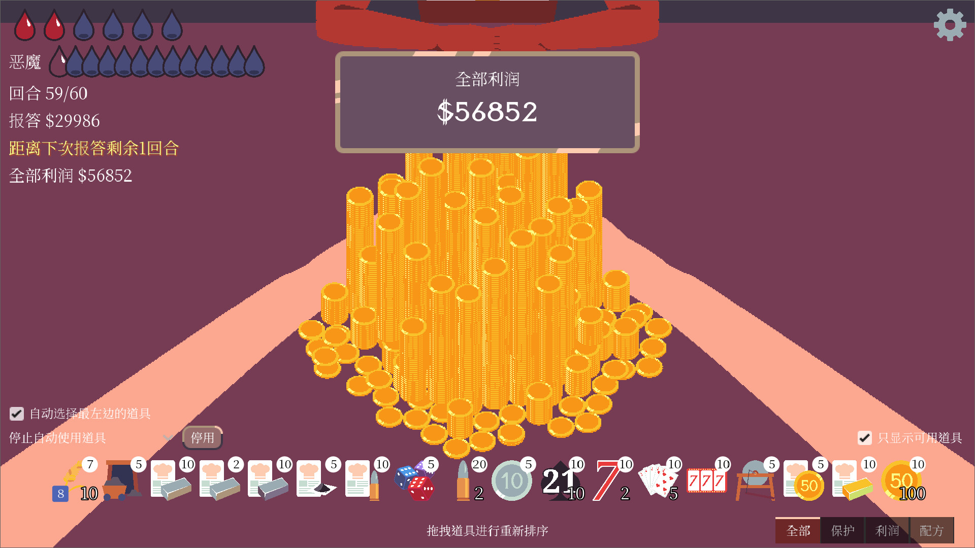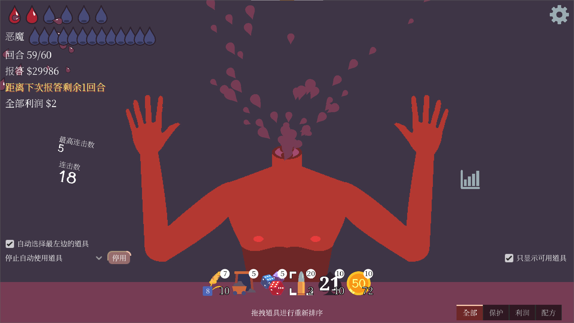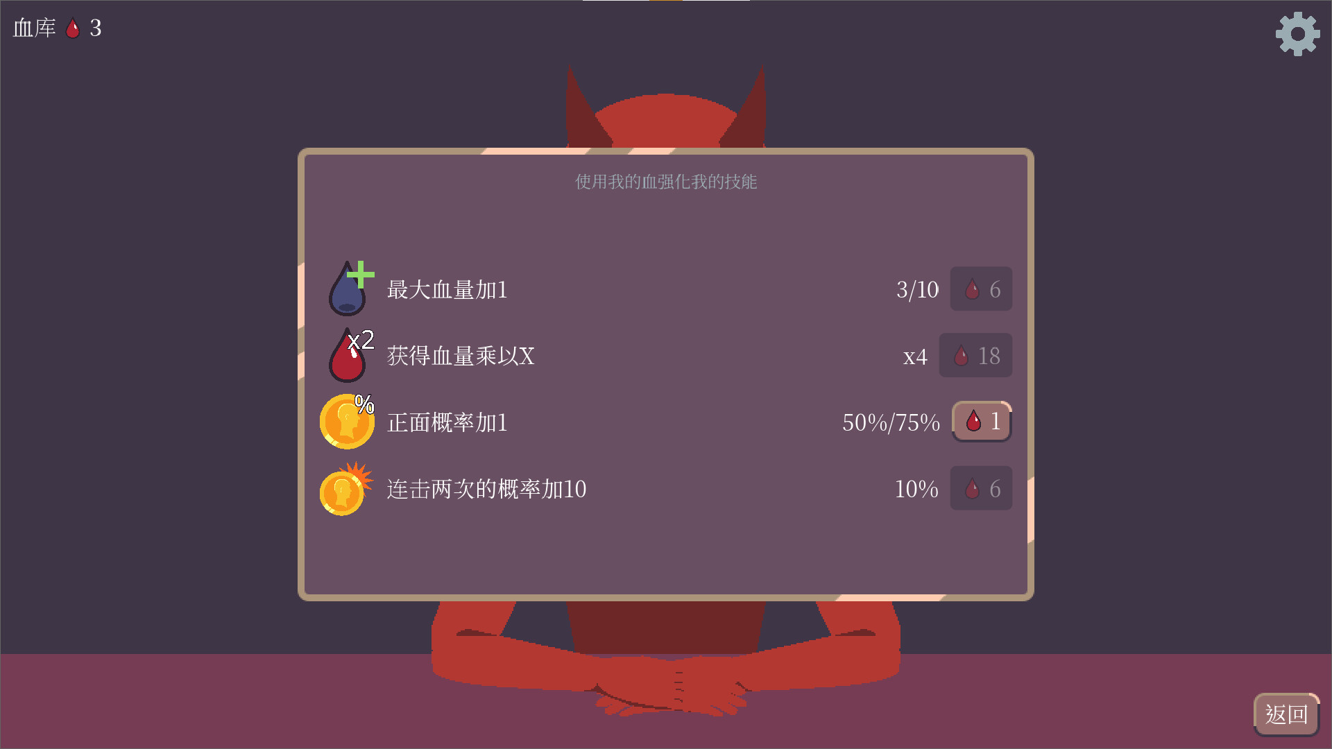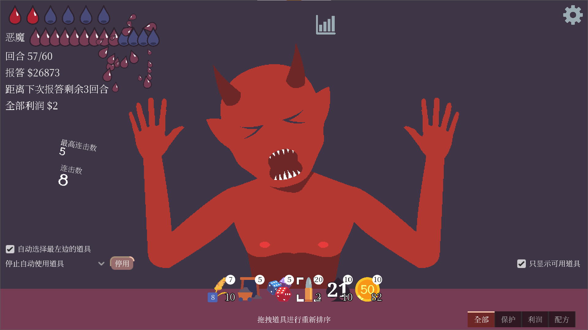 跟恶魔玩掷硬币游戏。获得利润、支付一点代价、购买道具并且升级它们。让我们成为百万富翁吧!