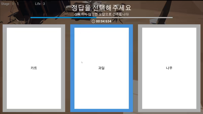 메인 스테이지로 이동하고 잠시 후, 한 플레이어에게 3개의 단어 선택지가 제공되고