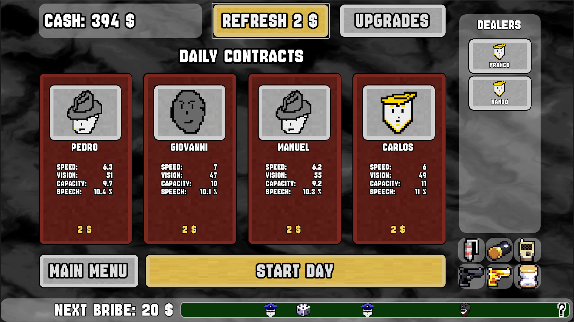 Pay Your Crimes is a Tactical Management game with elements of real-time strategy. You play as a mafia boss who must upgrade your drug dealers, hire new ones, and control them to sell drugs to the public. Earn as much money as you can and bribe the cops to maintain your freedom.