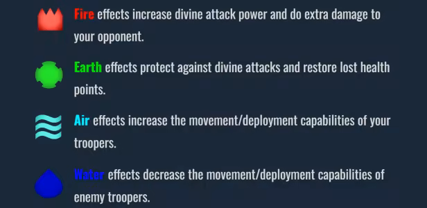Effect cards can dramatically change how you play but without making the game feel too whimsical or unbalanced.  Standard effect cards change common aspects/rules of the game and can be played by gods of any element.  Elemental effect cards, on the other hand, grant gods of the corresponding element special abilities only they can possess.  In general: