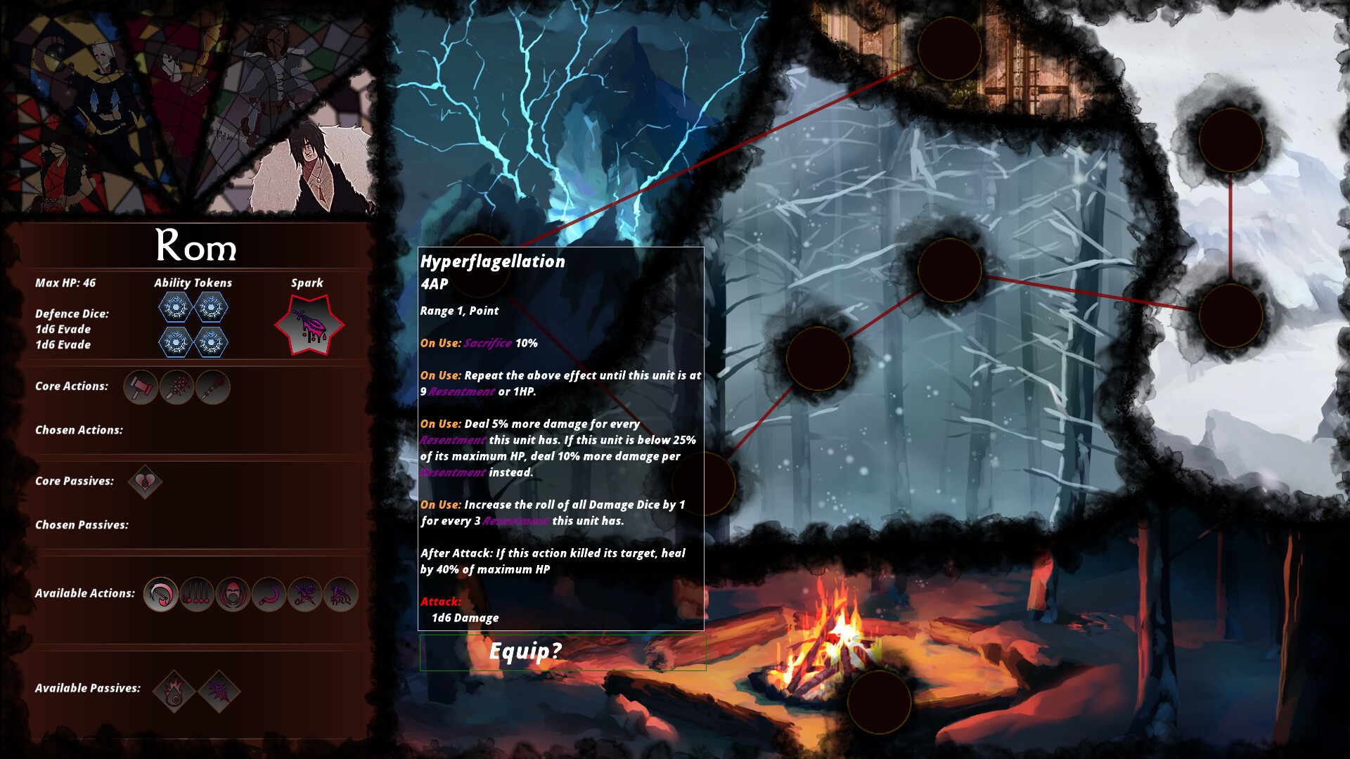 Despite this, you face overwhelming odds. Mistakes will be frequent and damage is often crippling. Your main resource, Ember, can heal the party's wounds. That same resource is used to unlock abilities and upgrade your characters, to open optional paths, and to stay alive in the frozen wastes. These Embers will inevitably die out and your party will fall. You will return to the first page of their story, and begin again.