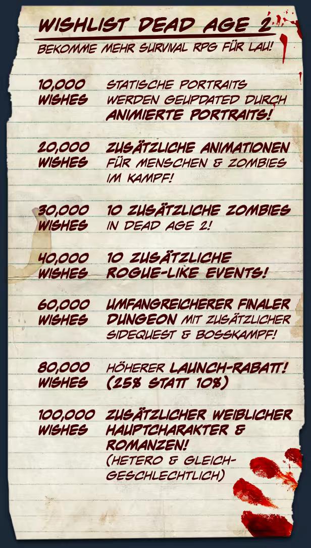 Du kannst unser Survival RPG qualitativ verbessern mit unserem Wunschlisten Event. Einfach das Spiel auf die Wunschliste packen und dadurch mehr coole Features freischalten, wenn die Ziele erreicht werden.