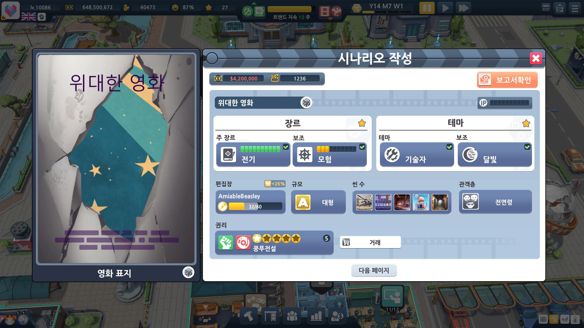 Super Movie Tycoon에서 영화계 거물이 되세요! 각본부터 촬영까지, 드림팀을 꾸려 할리우드를 정복하세요!