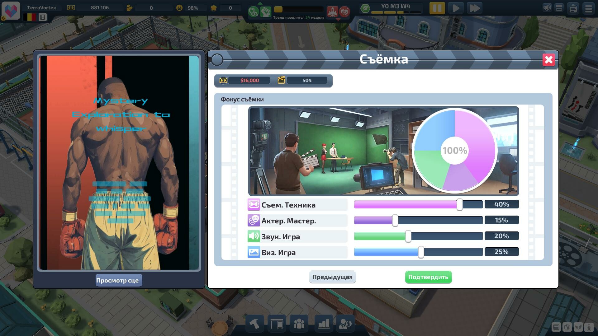 Станьте кинематографическим магнатом в Super Movie Tycoon! От сценария до экрана - соберите команду мечты и покорите Голливуд!