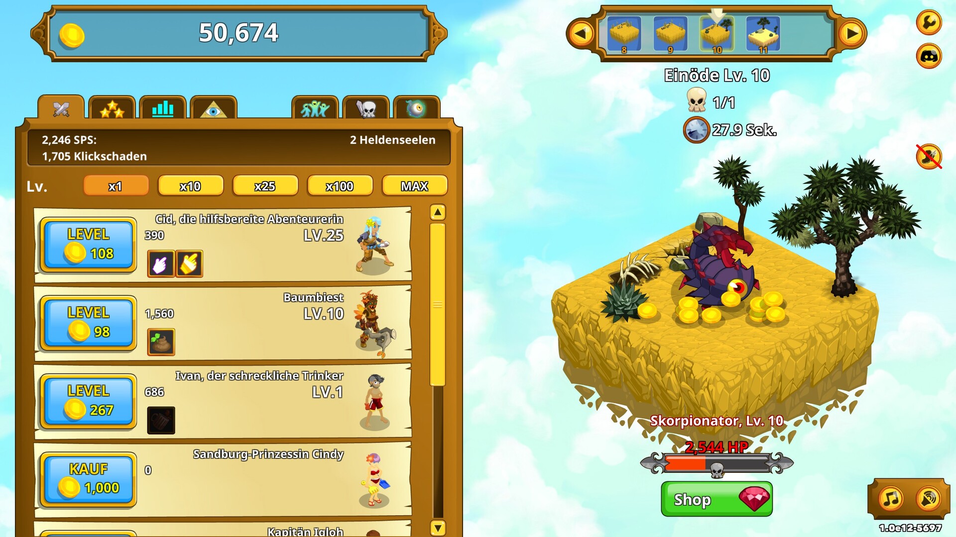 Beginne damit, dass du auf Monster klickst und dir ihr Gold holst, mit dem du neue Helden anheuern und mehr Schaden anrichten kannst. Je mehr Schaden du austeilst, desto mehr Gold bekommst du. Spüre, wie deine Macht exponentiell wächst und du der mächtigste aller Helden wirst!