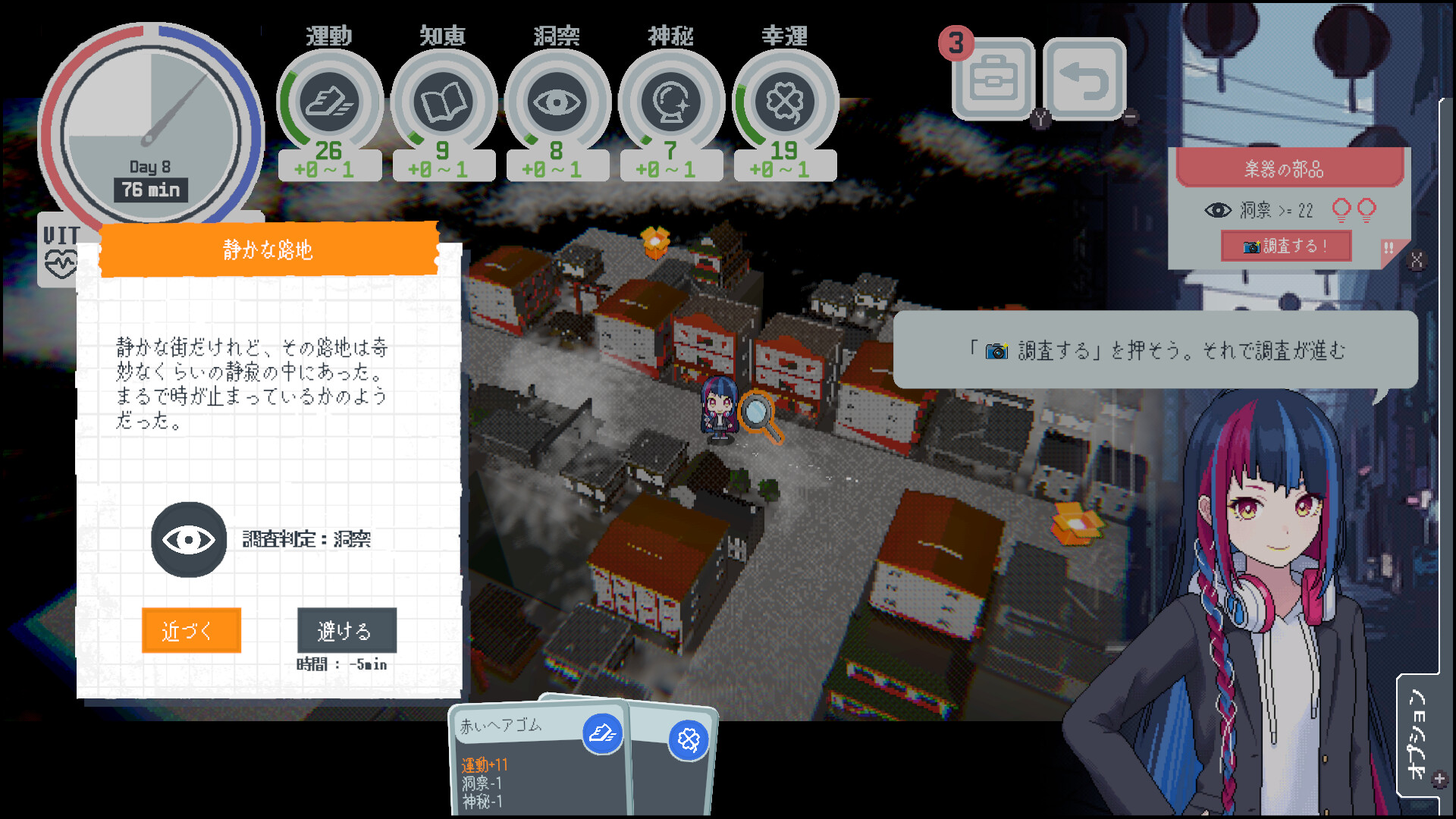 イベントでは「運動」「知恵」「洞察」「神秘」「幸運」の5つのパラメータで「調査判定」が行われることがあります。