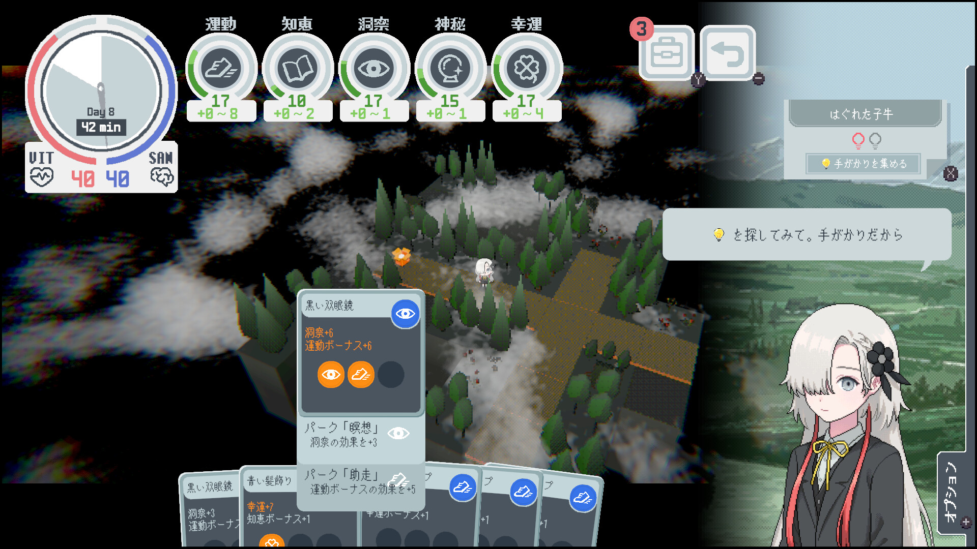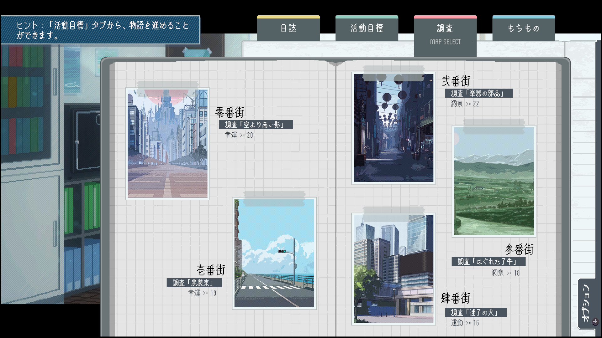 街を歩き回り、各地で発生しているイベントを見つけることで少しずつ調査が進みます。
