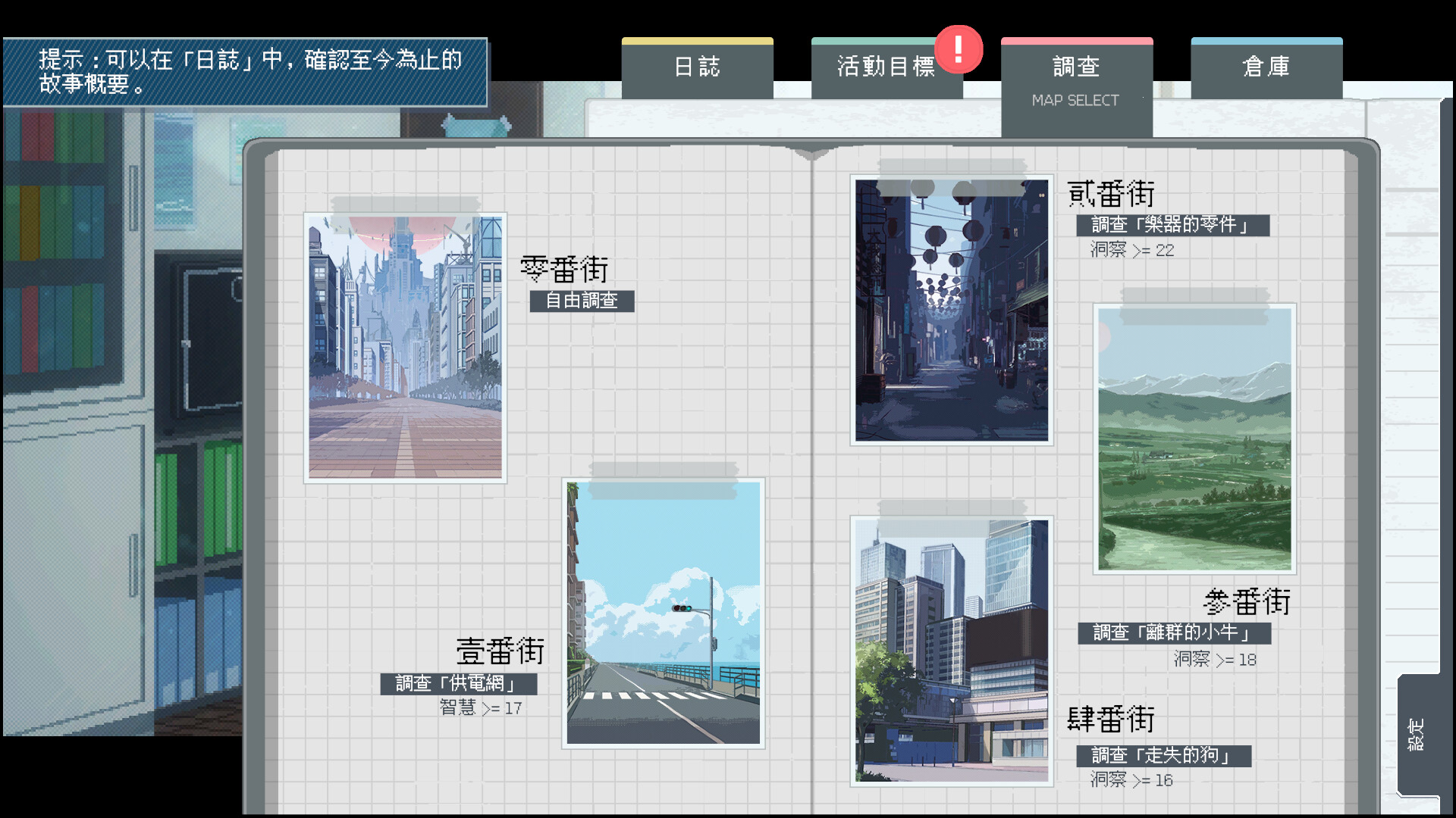 在調查環節中進行調查、獲取道具,即可推進劇情。