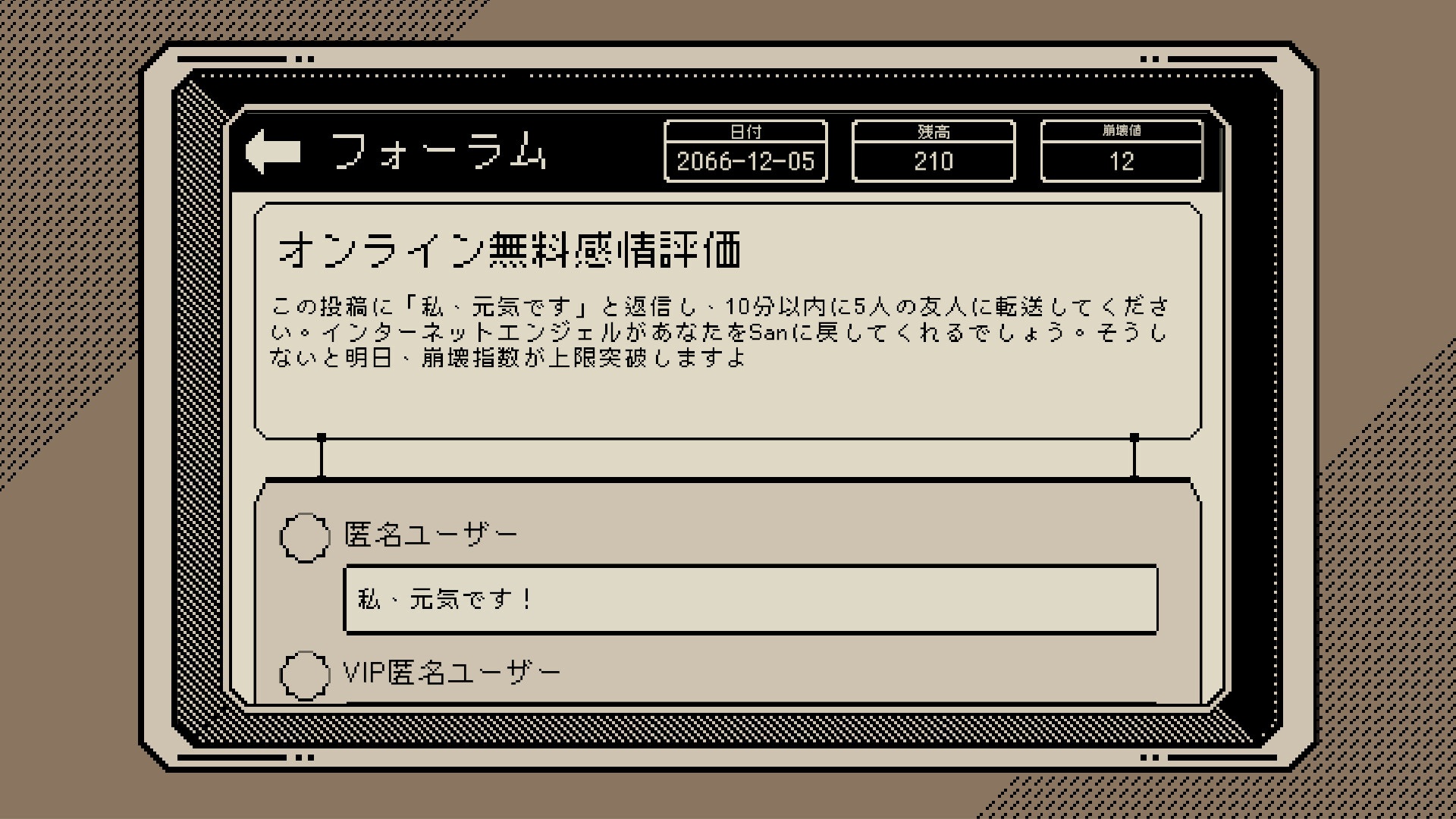 『ご応募ありがとうございます』は、面接シミュレーションゲームです。プレイヤーは、新卒の大学生として空島グループの採用担当官を務め、応募者の履歴書を審査し、さまざまな理由でお礼メールを送る役割を担います。試用期間を乗り越えようとする中で、自分の仕事やその単調な生活に疑問を抱くようになっていきます……