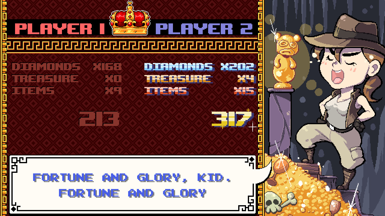 ALL-STARS DUNGEONS AND DIAMONDS (ASDAD for short) is a competitive Arcade-style game where two players face each other in a diamond-collecting race. The player with the largest number of gems at the end of the round wins. Things quickly become more complicated, though, as collecting diamonds will reveal items buried underground that will grant players the ability to attack the opponent or obtain temporary boosts that will help them win the race.