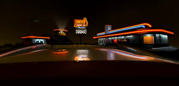 Ultra-detailed 1960s drive-in movie theater setting | Sit in a 1958 Buick convertible | Air traffic and animated birds | Vertigo effect
