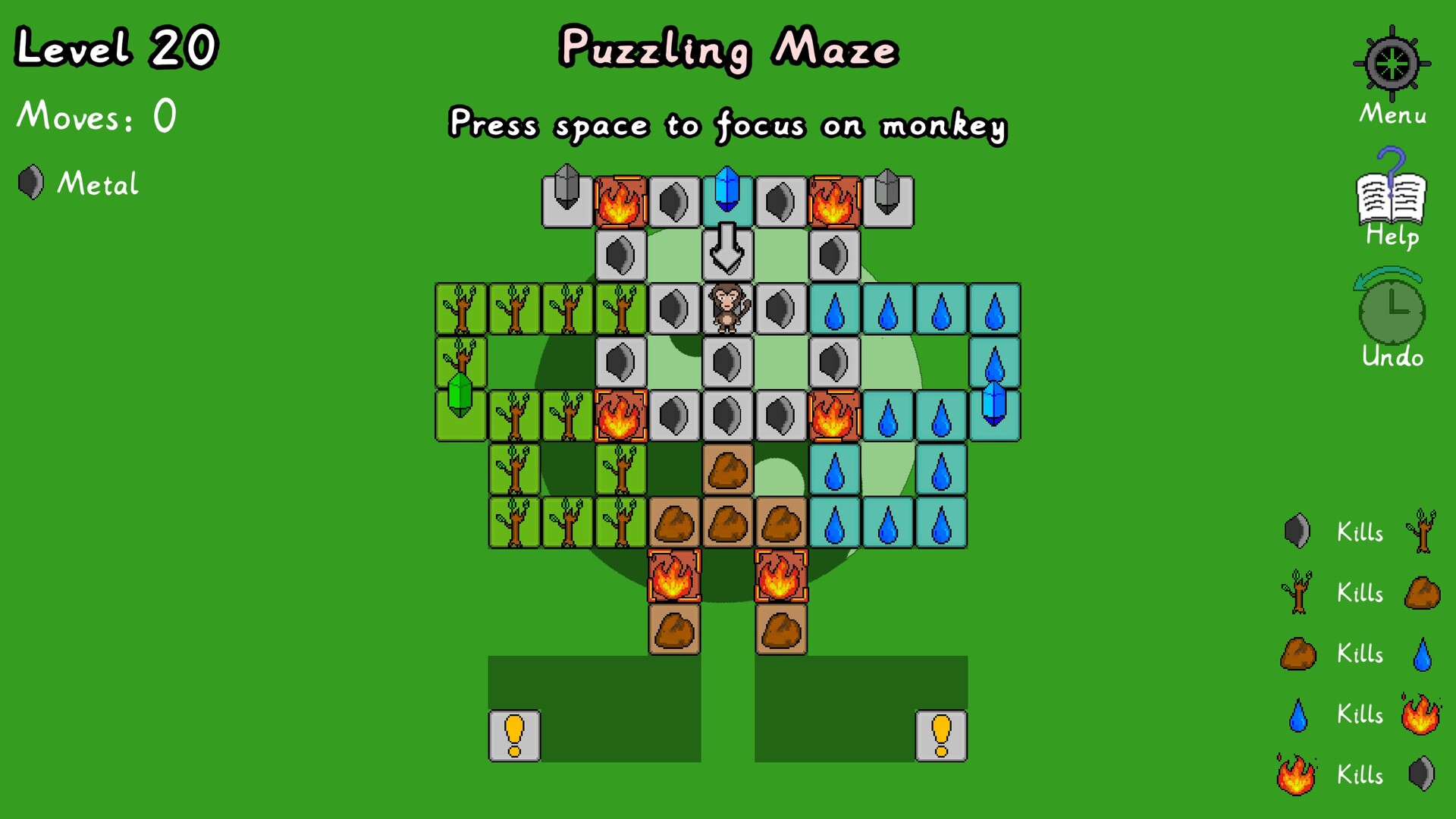 Every time you move, The block at your previous location will get destroyed, and depending on the direction you are moving to, all blocks will try to move in the same direction and destroy at most 1 adjacent block in that direction if its element is being countered. In addition, every game (level) the monkey will be assigned with an element. If you step on a block that counters your element or there is no direction you can move, the game is over.