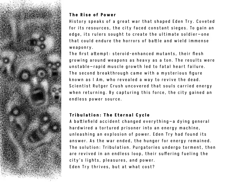 The year is 40XX. Eden Try: a city powered by pain. Buildings, lights, street signs, vending machines—all run on the agony of those unfortunate to endure Tribulation.