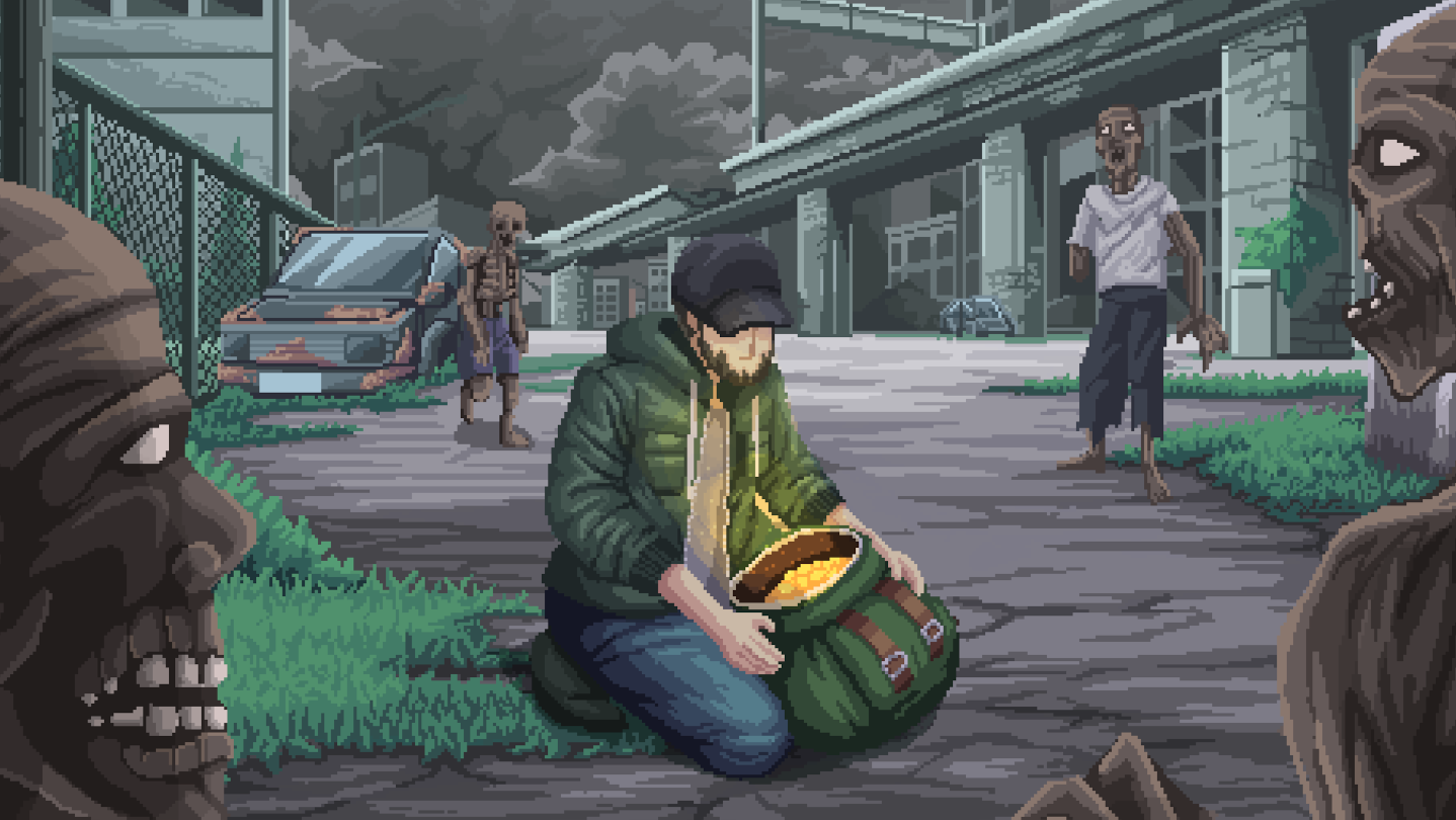 What your character can do is decided by what items you have and the upgrades that you choose. Items are gathered either from scavenging wrecked cars or dropped by killed enemies. These items vary in utility from "consumable" healing items, items that provide passive buffs and weapon items. While passive items will have an effect from inside your backpack, weapon items must be placed in belt slots to be used. Find the balance of item management in the different sections of your inventory while also avoiding dead-ends and masses of zombies.