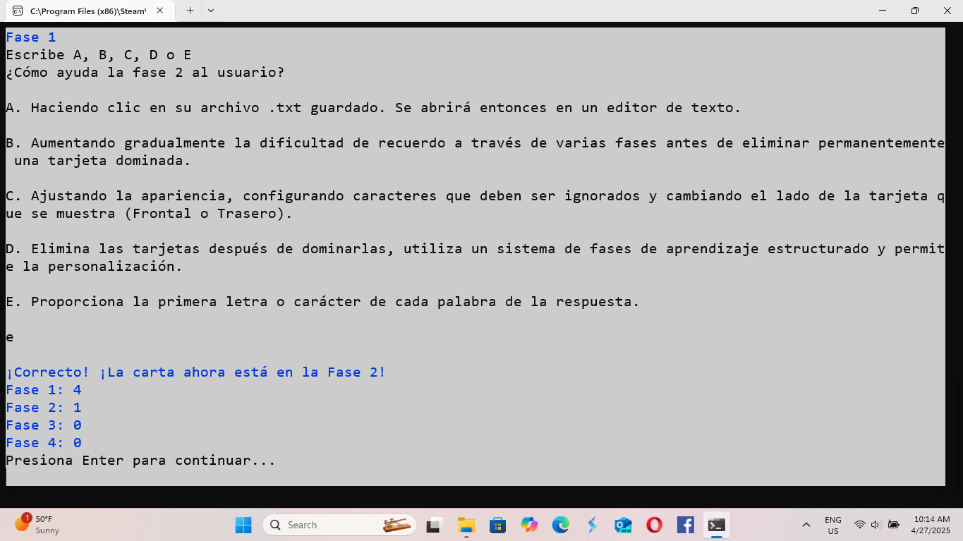 Trabajarás con hasta diez tarjetas a la vez para mantenerte concentrado y evitar sentirte abrumado. Solo aparecerá una nueva tarjeta cuando una de tus tarjetas actuales alcance la Fase 4 del proceso de aprendizaje.
