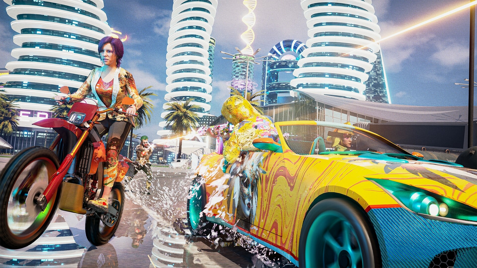 Explore skyscrapers, sci-fi libraries, alien temples, nightclubs, and suspended space stations—all fully accessible. Scale walls, leap across rooftops, zipline into enemy airships, or race through neon-lit avenues. No spot is off-limits. Combat unfolds on every vertical plane: ground, balconies, rooftops, basements, and even orbit.