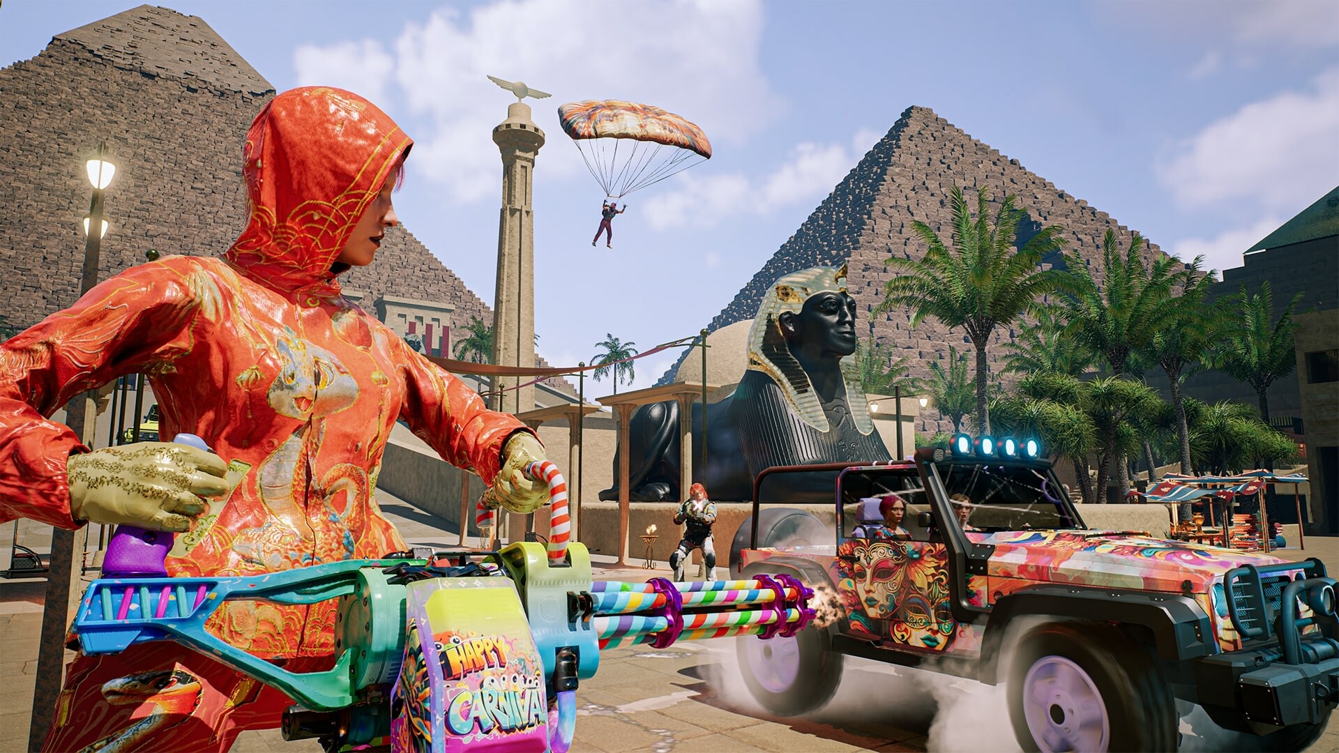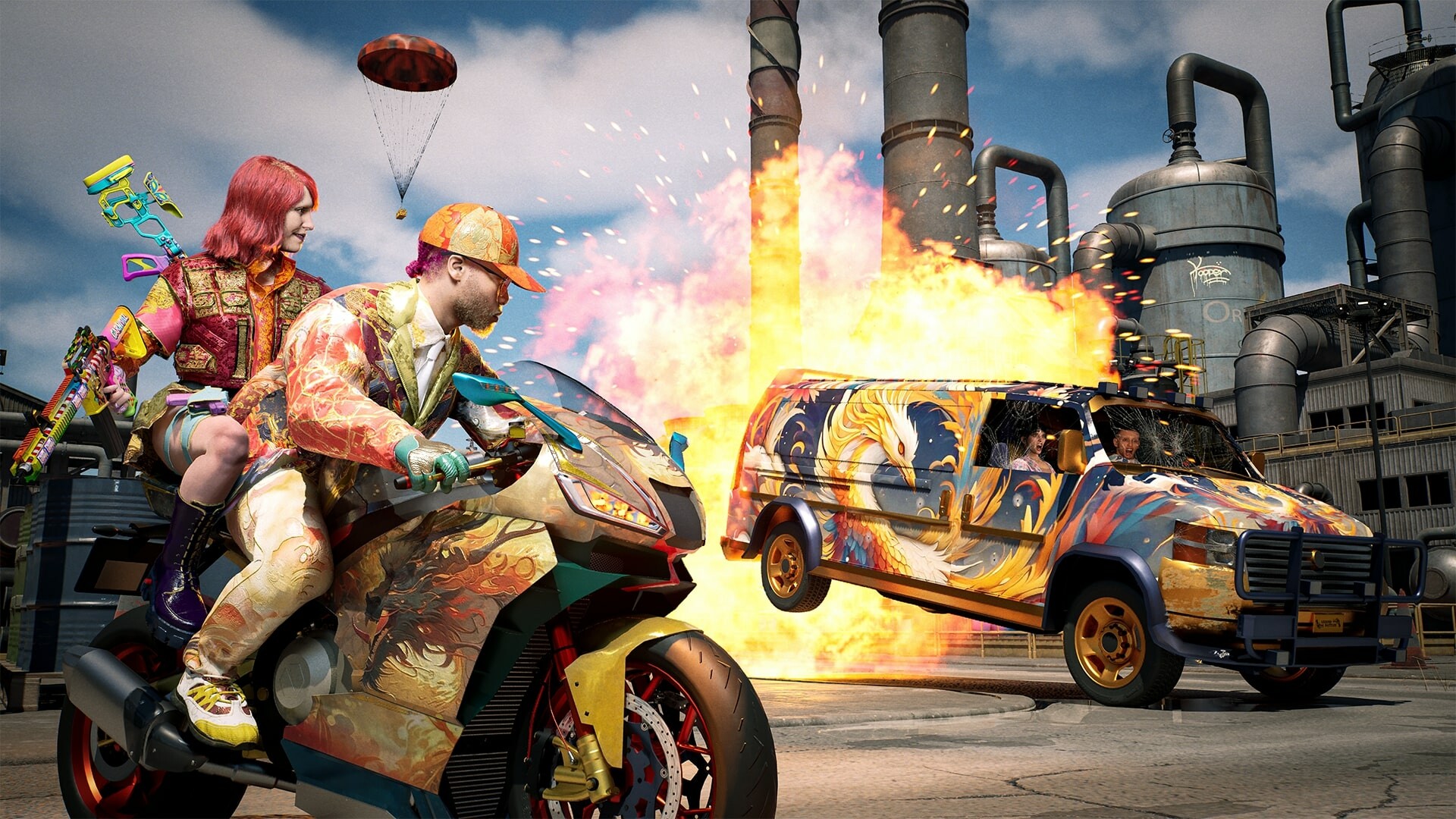 Leap from buildings, parachute in vibrant patterns, or make a last-second escape using ziplines. But beware—ambushes await. And if you’re lucky enough to find a helicopter, prepare for aerial chaos: ride with your squad, rain down fire from above, and enjoy the view—until an RPG lights you up.