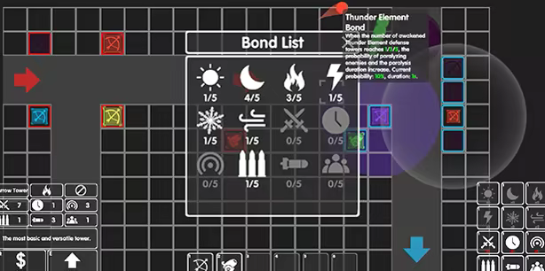 Le jeu propose six éléments de base : la lumière, l’obscurité, le feu, le tonnerre, la glace et le vent. Les joueurs peuvent les combiner et les associer librement pour doter les tours de défense de capacités uniques. Grâce à une association judicieuse des éléments, activez de puissants effets de lien, construisez votre système de défense ultime et laissez chaque tour déployer toute sa puissance !