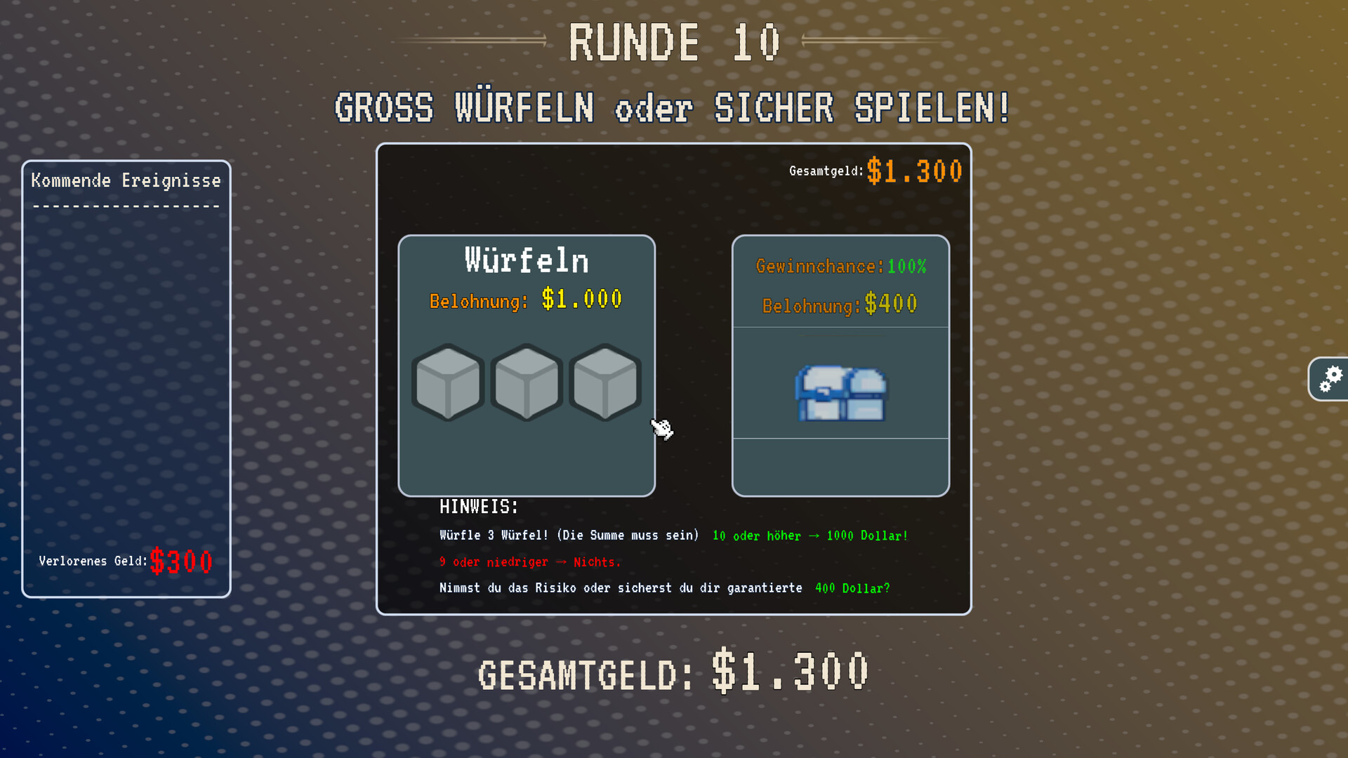 Aber denk daran: Wenn dein Geld auf 0 oder darunter fällt, ist das Spiel vorbei.
