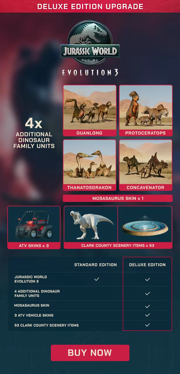 The Jurassic World Evolution 3: Deluxe Upgrade Pack features an additional four spectacular prehistoric species of family units; with male, female and juvenile variants: