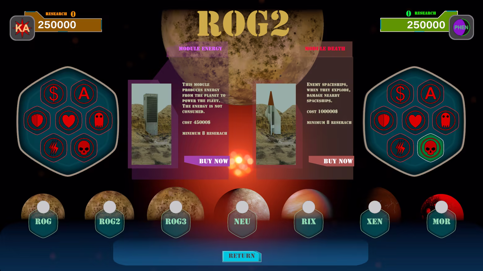 Build special buildings to defend your conquered planet. There are 7 different modules, each with unique potential. It is up to you and your strategy to buy the right module.